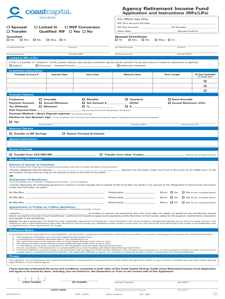 Agency Retirement Income Fund Application and Instructions (RIF's×Life) For Office Use Only RIF Term Account Number: Spousal Transfer Locked In RSP Conversion Qualified RIF Yes No Annuitant Mr. Mrs.