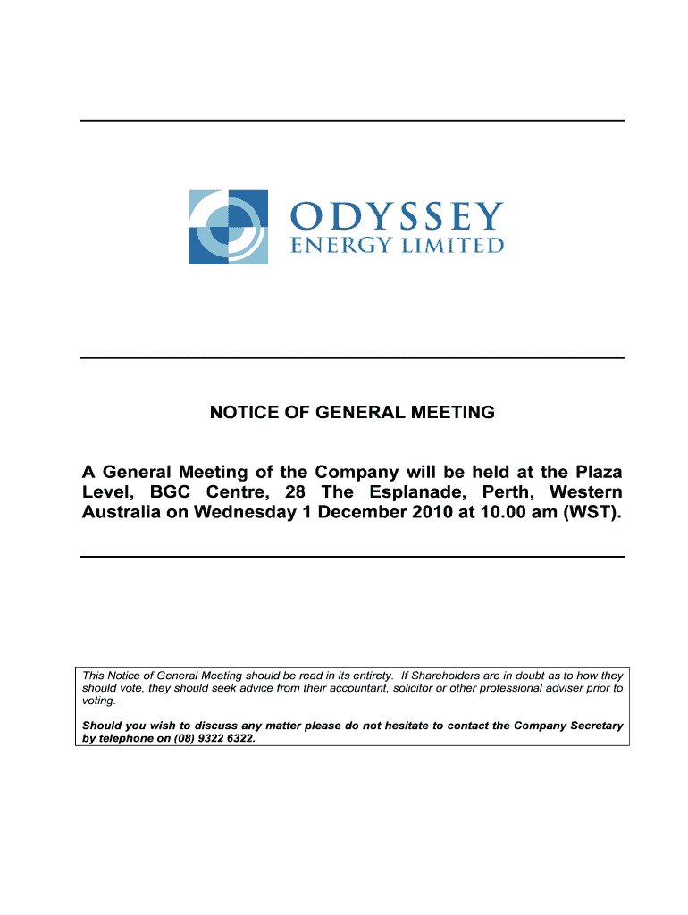ABN 73 116 151 636 NOTICE OF GENERAL MEETING A General Meeting of the Company will be held at the Plaza Level, BGC Center, 28 The Esplanade, Perth, Western Australia on Wednesday 1 December 2010 at