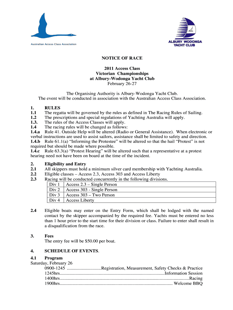 The Organizing Authority is Albury-Wodonga Yacht Club.