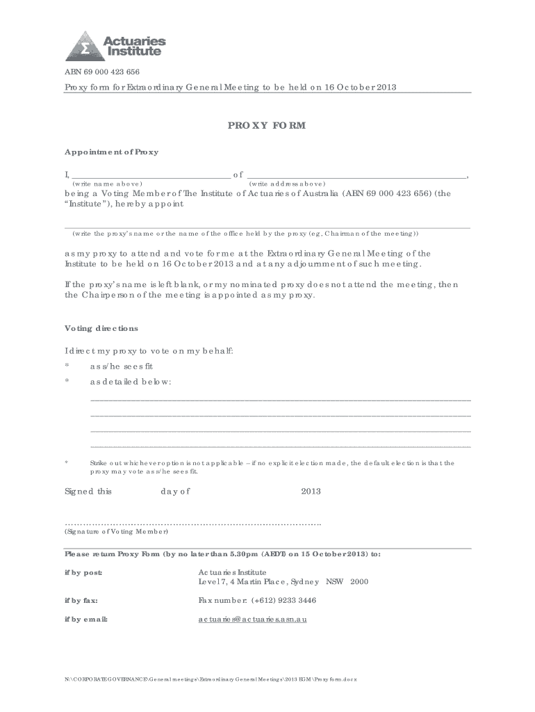 The Proxy Form is designed for voting members of The Institute of Actuaries of Australia who want to appoint a proxy to attend and vote in an Extraordinary General Meeting on their behalf.