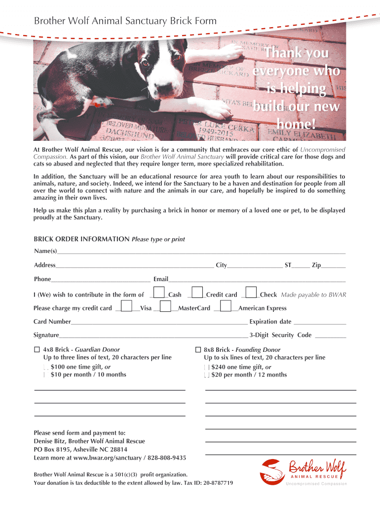 Get the free Brother Wolf Animal Sanctuary Brick Form - bwar