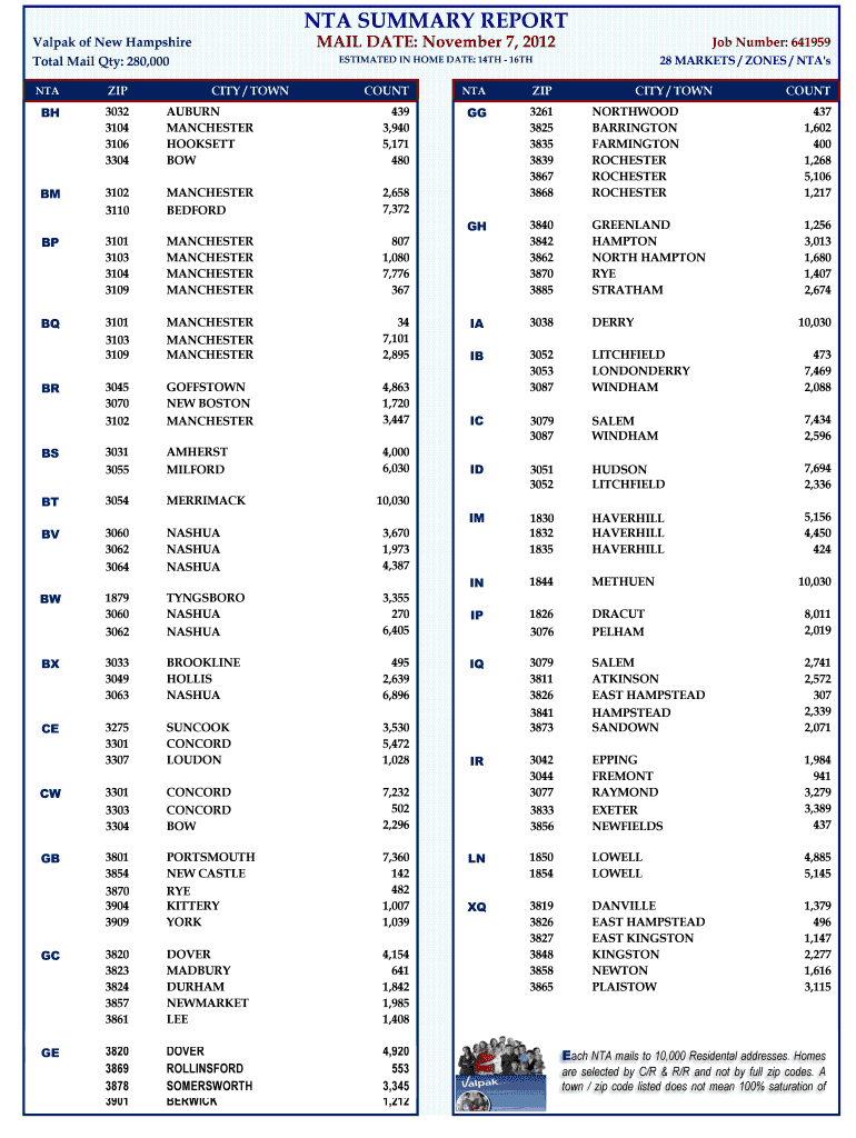 TNA SUMMARY REPORT MAIL DATE: November 7, 2012, Valley of New Hampshire Total Mail Qty: 280,000 TNA ZIP CITY / TOWN COUNT BH 3032 3104 3106 3304 AUBURN MANCHESTER HOOKS ETT BOW BM 3102 3110 MANCHESTER