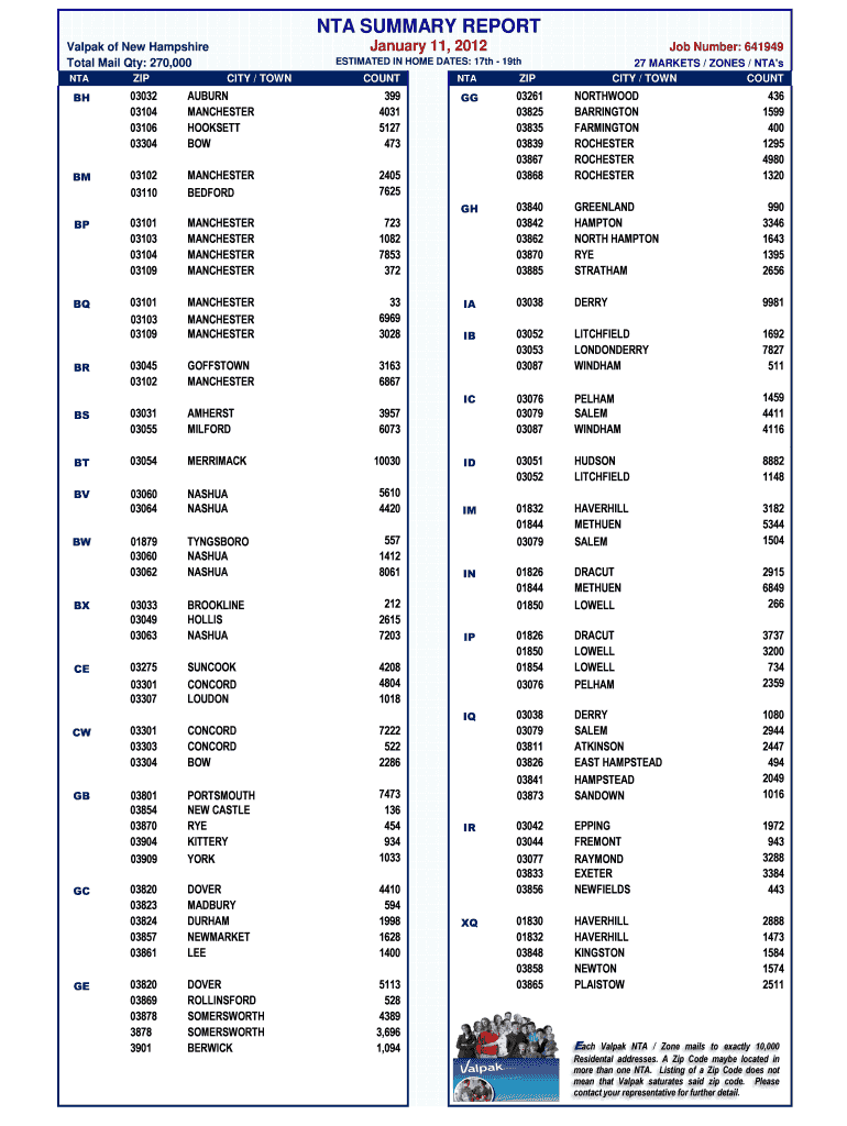TNA SUMMARY REPORT January 11, 2012, Valley of New Hampshire Total Mail Qty: 270,000 TNA ZIP Job Number: 641949 ESTIMATED IN HOME DATES: 17th 19th CITY / TOWN COUNT BH 03032 03104 03106 03304 AUBURN