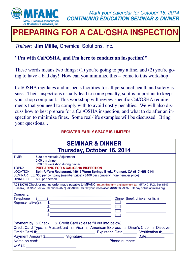 Mark your calendar for October 16, 2014, CONTINUING EDUCATION SEMINAR & DINNER PREPARING FOR A CAL×OSHA INSPECTION Trainer: Jim Middle, Chemical Solutions, Inc. “I'm with Cal×OSHA, and I'm here