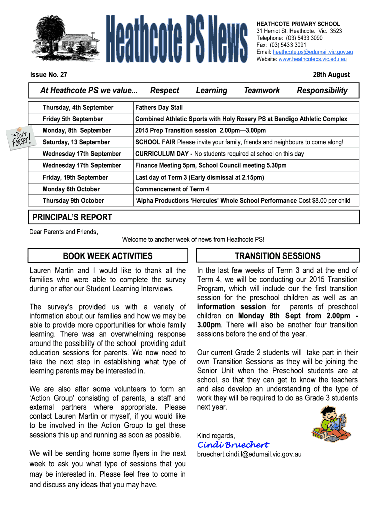 HEALTHCARE PRIMARY SCHOOL 31 Her riot St, Heath cote. Vic. 3523 Telephone: (03× 5433 3090 Fax: (03× 5433 3091 Email: heathcote.ps email.Vic.gov.AU Website: www.heathcoteps.vic.edu.au Issue No. 27