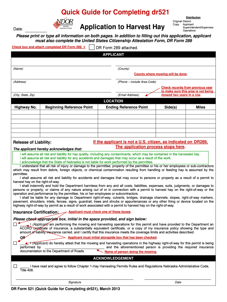 Quick Guide for Completing dr521 Application to Harvest Hay Date: Distribution Original: District Copy: Applicant Superintendent×Supervisor Operations Please print or type all information on both