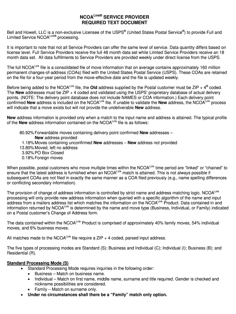 Coaling SERVICE PROVIDER REQUIRED TEXT DOCUMENT Bell and Howell, LLC is a non-exclusive Licensee of the USPS (United States Postal Service) to provide Full and Limited Service Coaling processing.