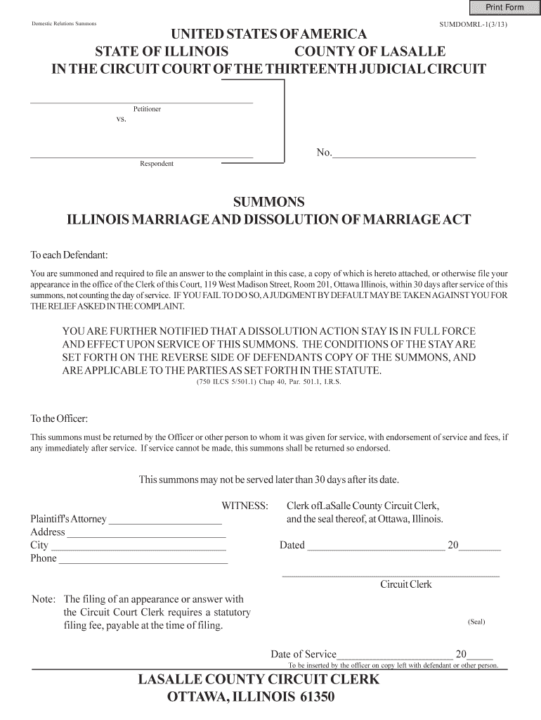 Print Form Domestic Relations Summons SUMDOMRL1×3/13) UNITED STATES OF AMERICA STATE OF ILLINOIS COUNTY OF BASALLY IN THE CIRCUIT COURT OF THE THIRTEENTH JUDICIAL CIRCUIT Petitioner vs. No. Respondent