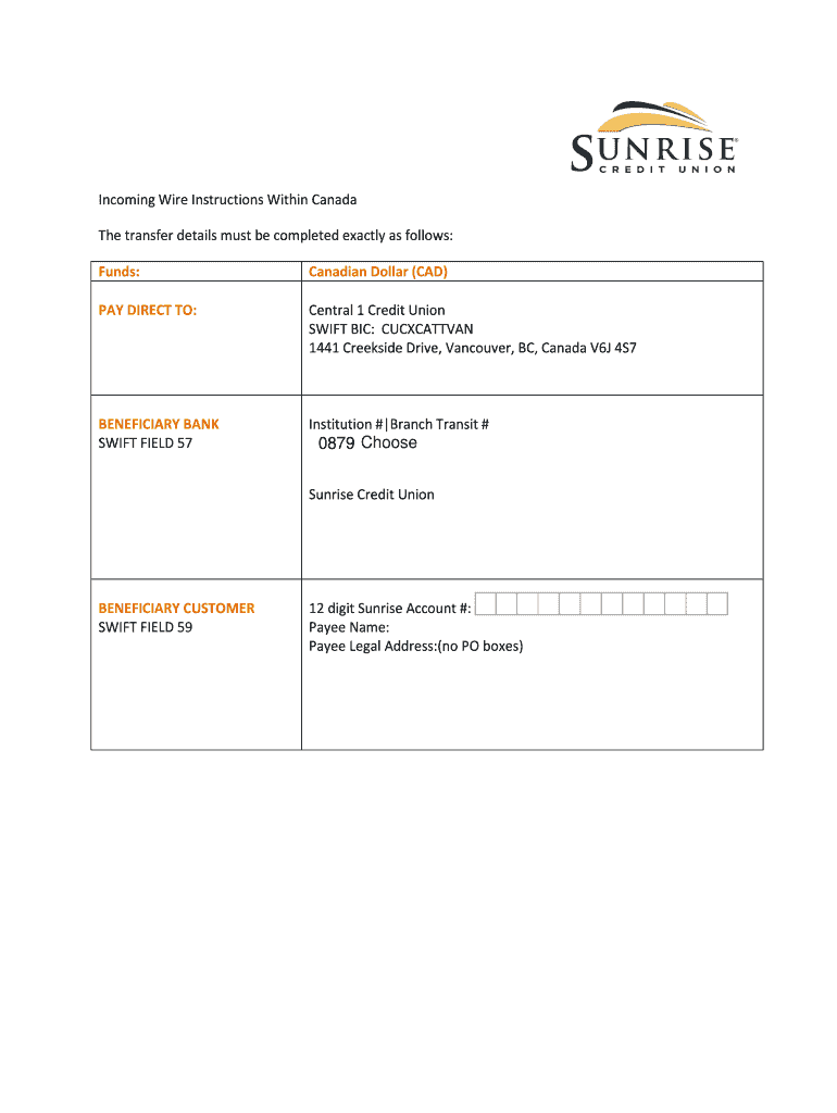 Incoming Wire Instructions Within Canada The transfer details must be completed exactly as follows: Funds: Canadian Dollar (CAD) PAY DIRECT TO: Central 1 Credit Union SWIFT BIC: CUCXCATTVAN 1441 Creekside