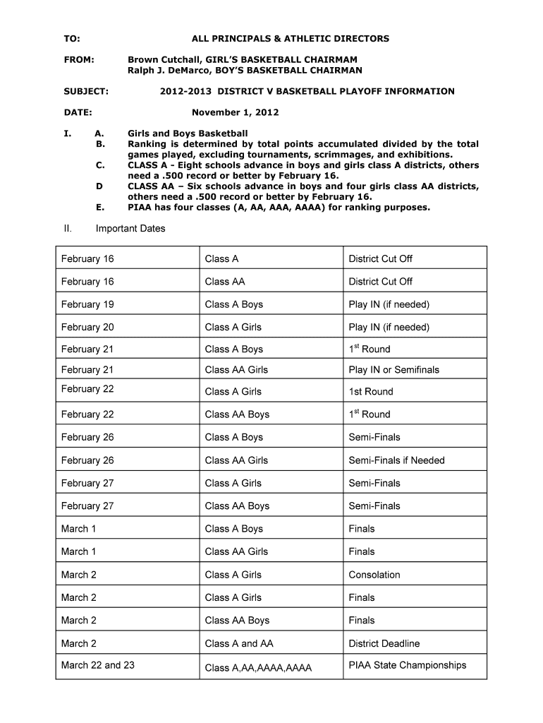 TO: ALL PRINCIPALS & ATHLETIC DIRECTORS FROM: Brown Catchall, GIRLS BASKETBALL CHAIRMAN Ralph J. DeMarco, BOYS BASKETBALL CHAIRMAN SUBJECT: DATE: I. 20122013 DISTRICT V BASKETBALL PLAYOFF INFORMATION
