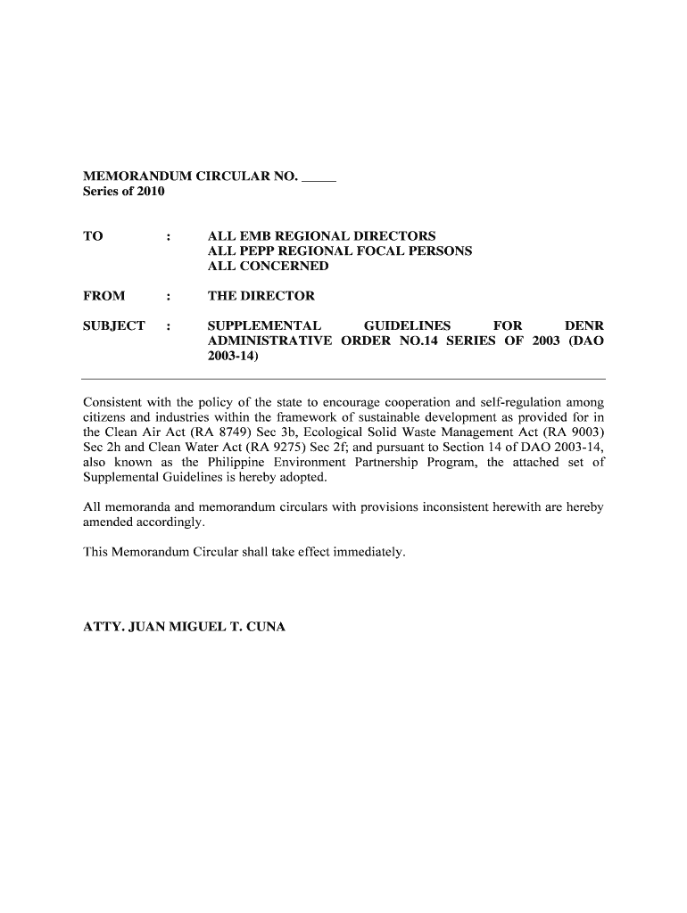 This memorandum circular provides supplemental guidelines for the implementation of DENR Administrative Order No. 14 Series of 2003, promoting cooperation and self-regulation in environmental management