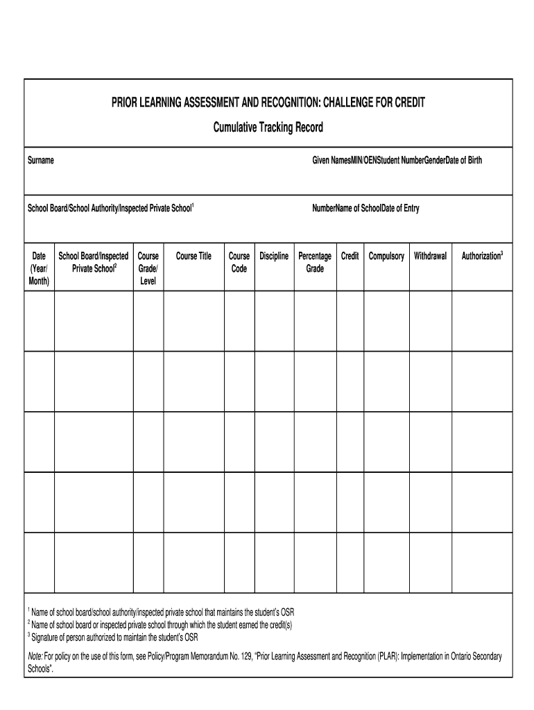 The Ontario Prior Learning Assessment and Recognition Form is designed for secondary school students in Ontario who wish to apply for credits based on prior learning and experiences.