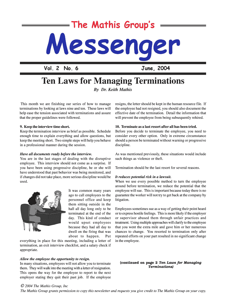 The Mathis Groups Messenger Vol. 2 No. 6 June 2004 Ten Laws for Managing Terminations By Dr. Keith Mathis This month we are finishing our series of how to manage terminations by looking at laws nine