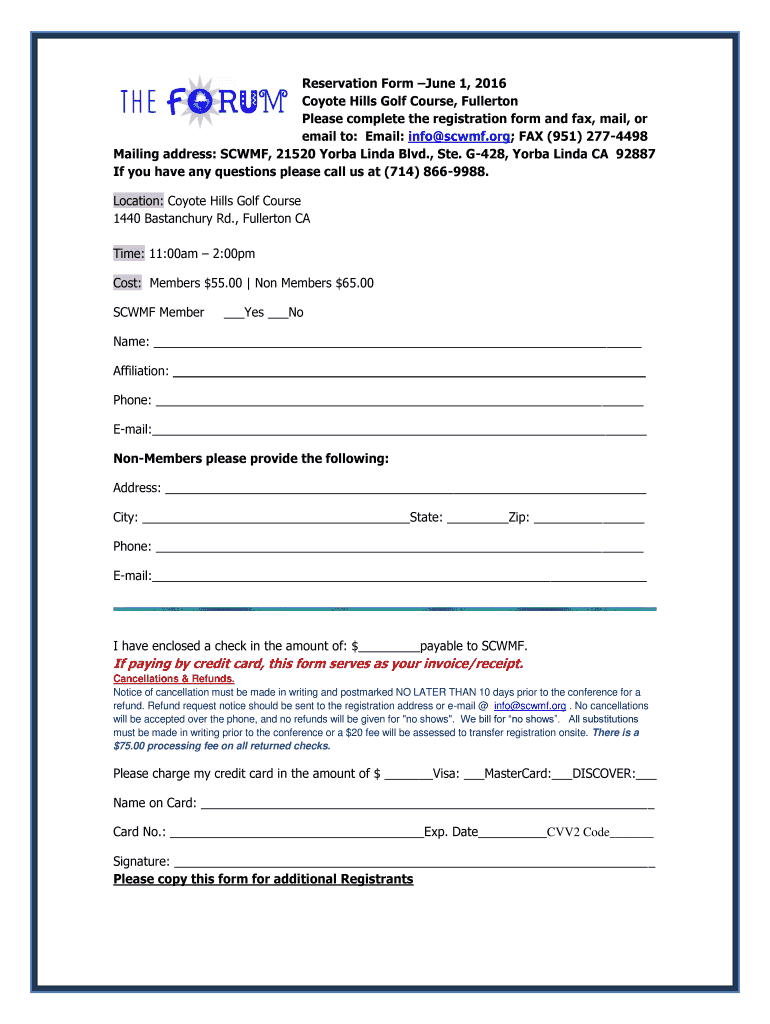 Reservation Form June 1, 2016, Coyote Hills Golf Course, Fullerton Please complete the registration form and fax, mail, or email to: Email: info scam.org; FAX (951× 2774498 Mailing address: SC WMF,