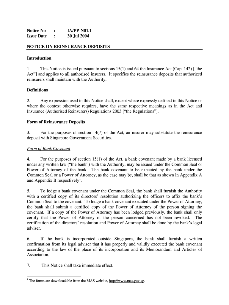 This Notice specifies the reinsurance deposits that authorized reinsurers shall maintain with the Authority, issued pursuant to the Insurance Act and applicable to all authorized insurers.