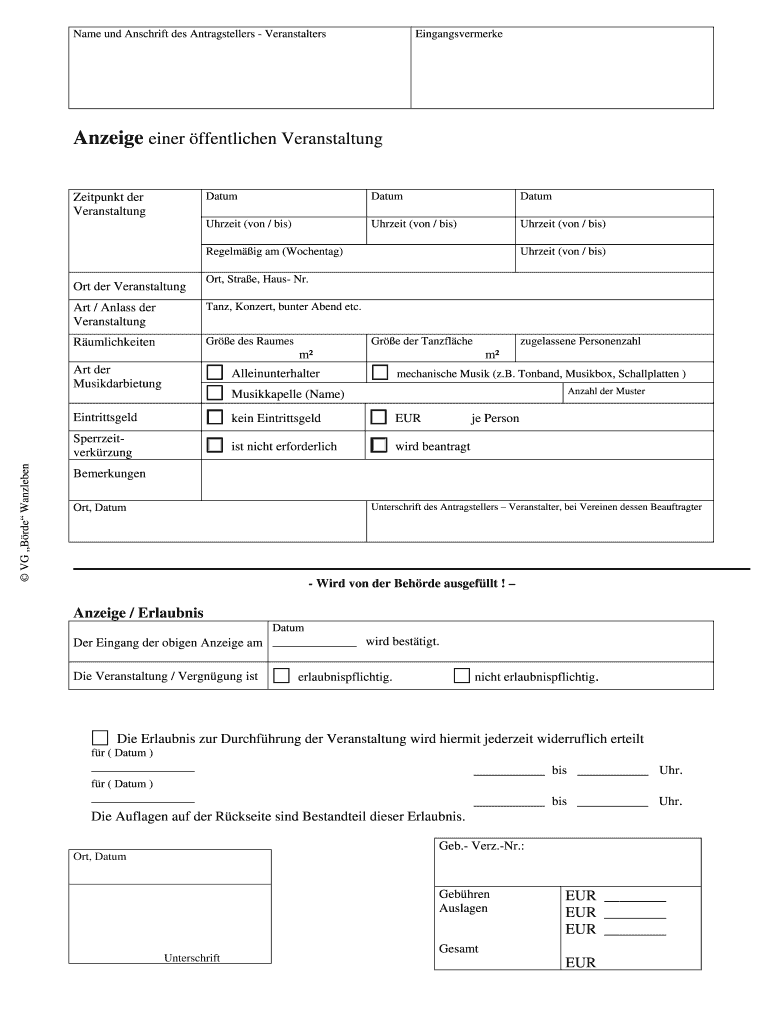 Eingangsvermerke Name UND Antichrist DES Antragstellers Veranstalters Engage anger ffentlichen Veranstaltung Datum Datum Datum Threat (on / bis) Zeitpunkt her Veranstaltung Threat (on / bis) Threat
