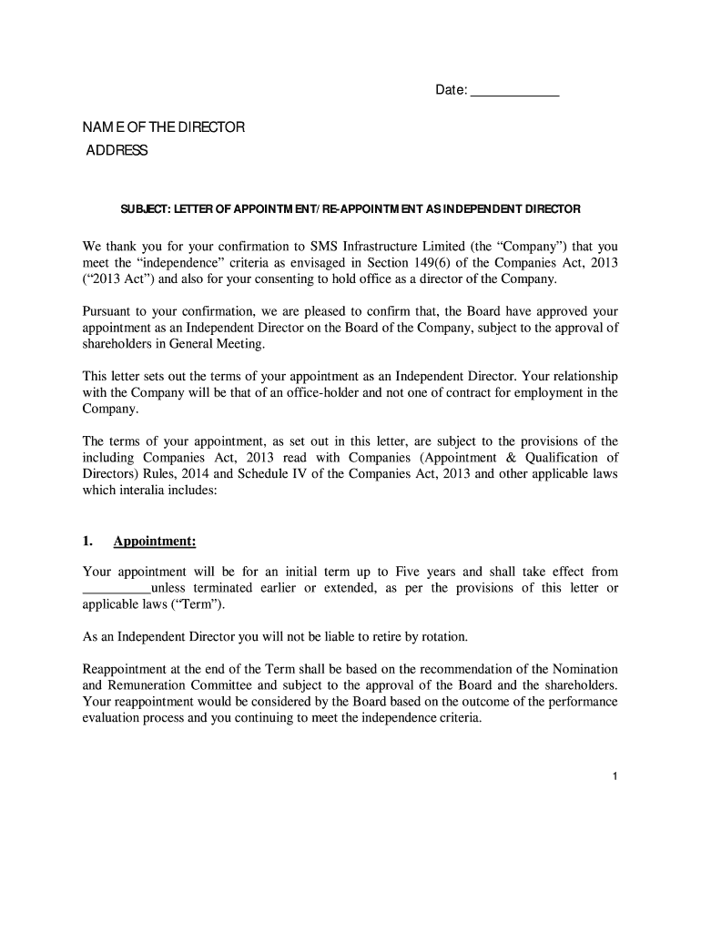 Date: NAME OF THE DIRECTOR ADDRESSSUBJECT: LETTER OF APPOINTMENT×REAPPOINTMENT AS INDEPENDENT Director thank you for your confirmation to SMS Infrastructure Limited (the Company) that you meet the