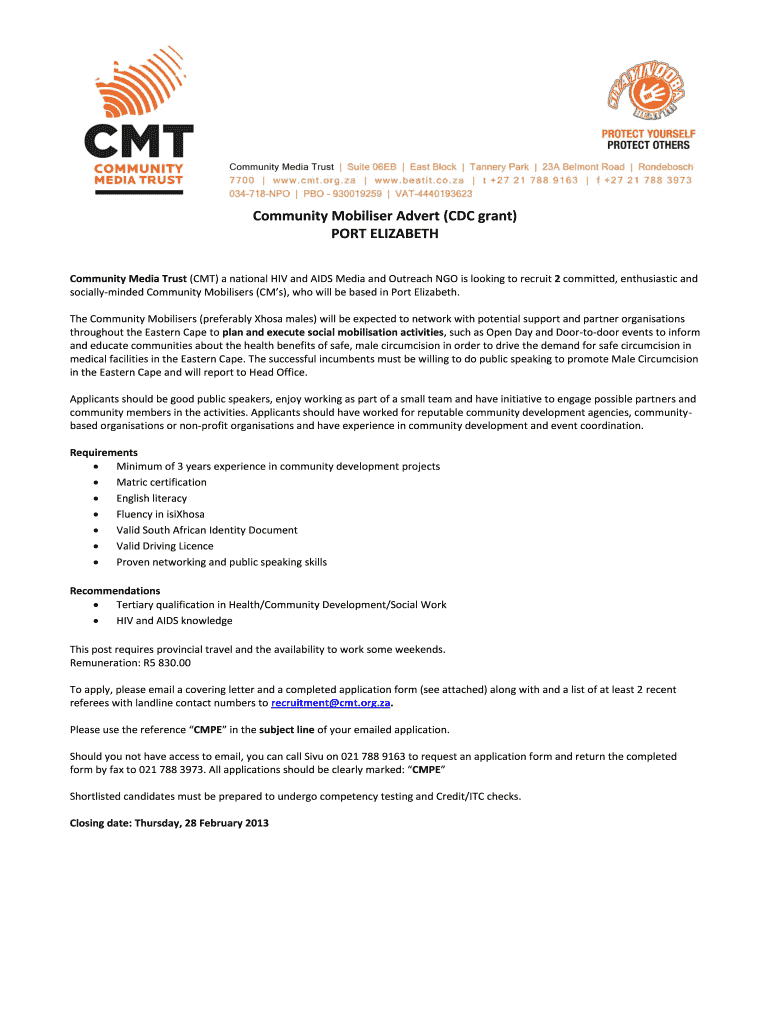 Get the free Community Mobiliser Advert CDC grant PORT ELIZABETH - cmt org