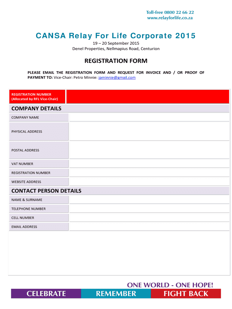 CANS Relay For Life Corporate 2015 19 20 September 2015. Deneb Properties, Nellmapius Road, Centurion. REGISTRATION FORM. PLEASE EMAIL THE REGISTRATION FORM ...