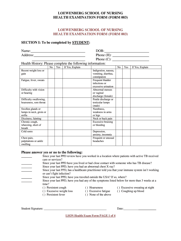 HEALTH EXAMINATION FORM (FORM 003×ROSENBERG SCHOOL OF NURSING