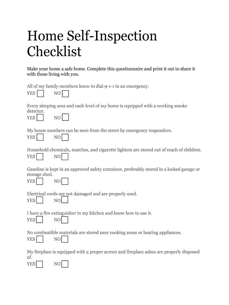 Home SelfInspection Checklist Make your home a safe home. Complete this questionnaire and print it out to share it with those living with you. All of my family members know to dial 911 in an emergency.