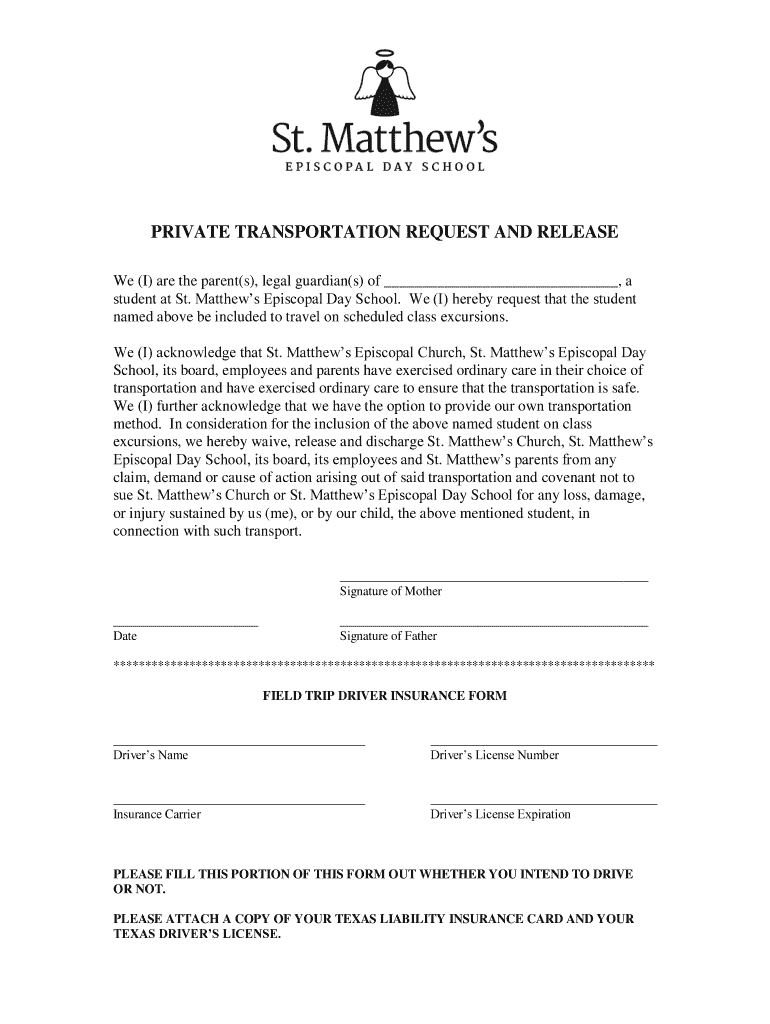 PRIVATE TRANSPORTATION REQUEST AND RELEASE We (I) are the parent’s), legal guardian’s) of, a student at St. Matthews Episcopal Day School. We (I) hereby request that the student named above be