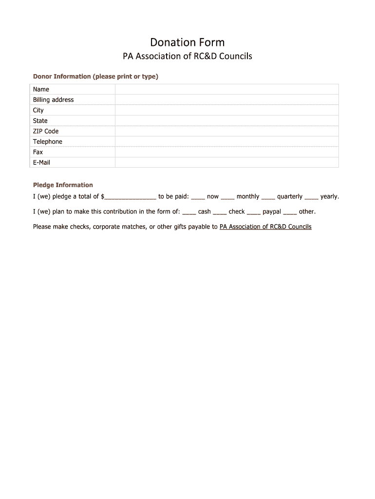 Donation Form PA Association of RCD Councils Donor Information (please print or type) Name Billing address City State ZIP Code Telephone Fax Email Pledge Information I (we) pledge a total of $ to