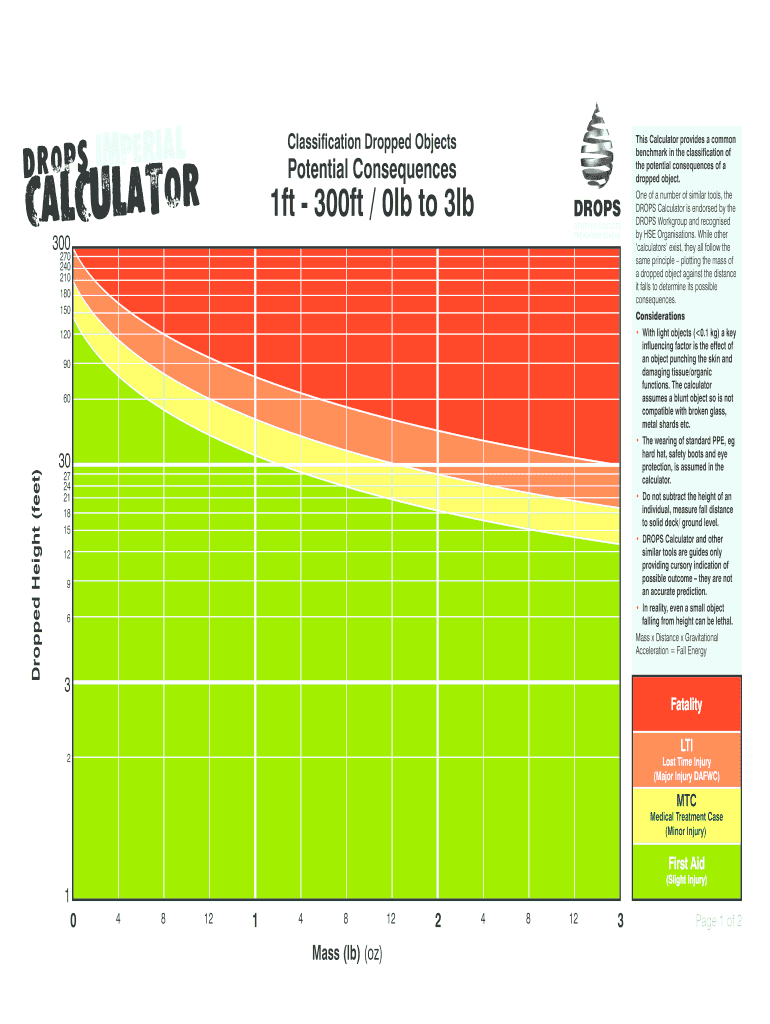 DROPS imPEriALClassification Dropped ObjectsThis Calculator provides a common benchmark in the classification of the potential consequences of a dropped object. One of a number of similar tools, the