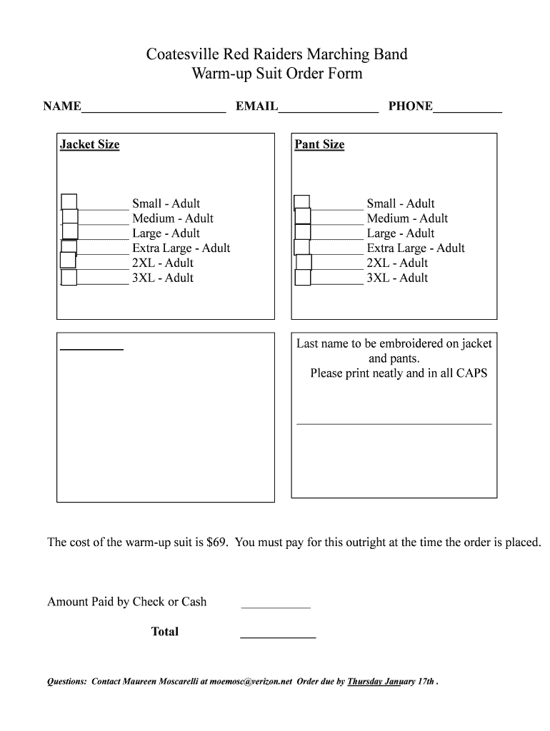 Batesville Red Raiders Marching Band Warm up Suit Order Form NAME EMAIL PHONE Jacket Size Pant Size Small Adult Medium Adult Large Adult Extra Large Adult 2XL Adult 3XL Adult Small Adult Medium Adult