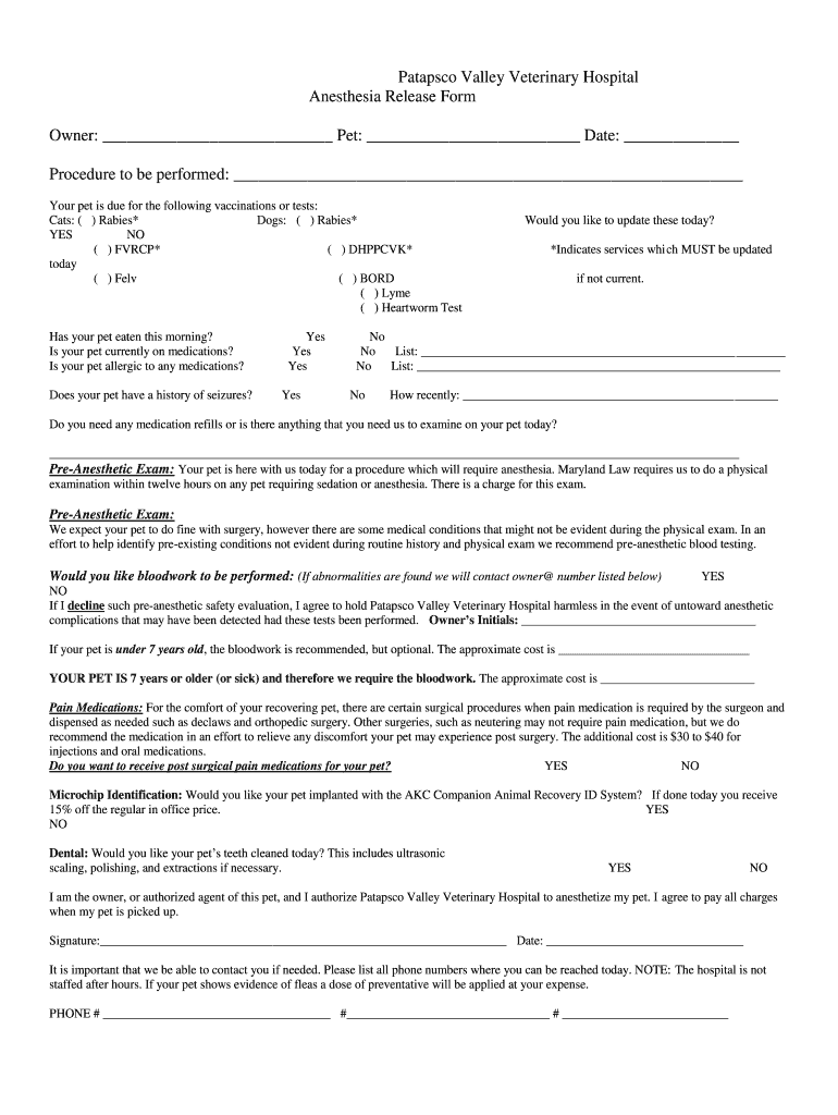 Tabasco Valley Veterinary Hospital Anesthesia Release Form Owner: Pet: Date: Procedure to be performed: Your pet is due for the following vaccinations or tests: Cats: () Rabies* Dogs: () Rabies* YES