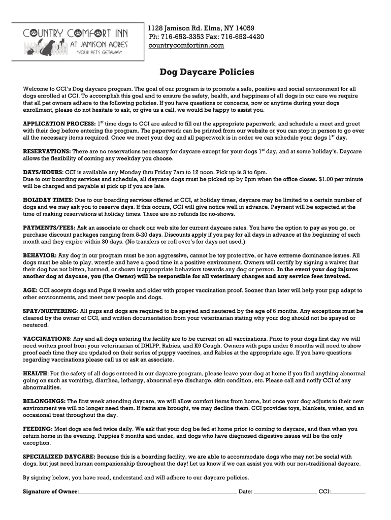 1128 Jamison Rd. Elma, NY 14059 pH: 7166523353 Fax: 7166524420 countrycomfortinn.com Dog Daycare Policies Welcome to CCI Dog daycare program. The goal of our program is to promote a safe, positive