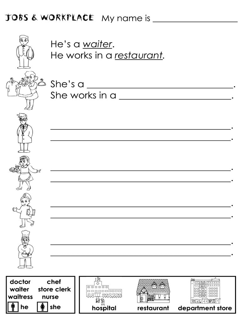 Jobs & Workplace My name is He's a waiter. He works in a restaurant. She's a . She works in a . . . . . . . . . Doctor chef waiter store clerk waitress nurse he she hospital restaurant department