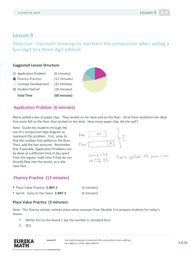 Lesson 9 24 A STORY OF UNITS Lesson 9 Objective: Use math drawings to represent the composition when adding a two digit to a three digit addend. Suggested Lesson Structure Application Problem Fluency