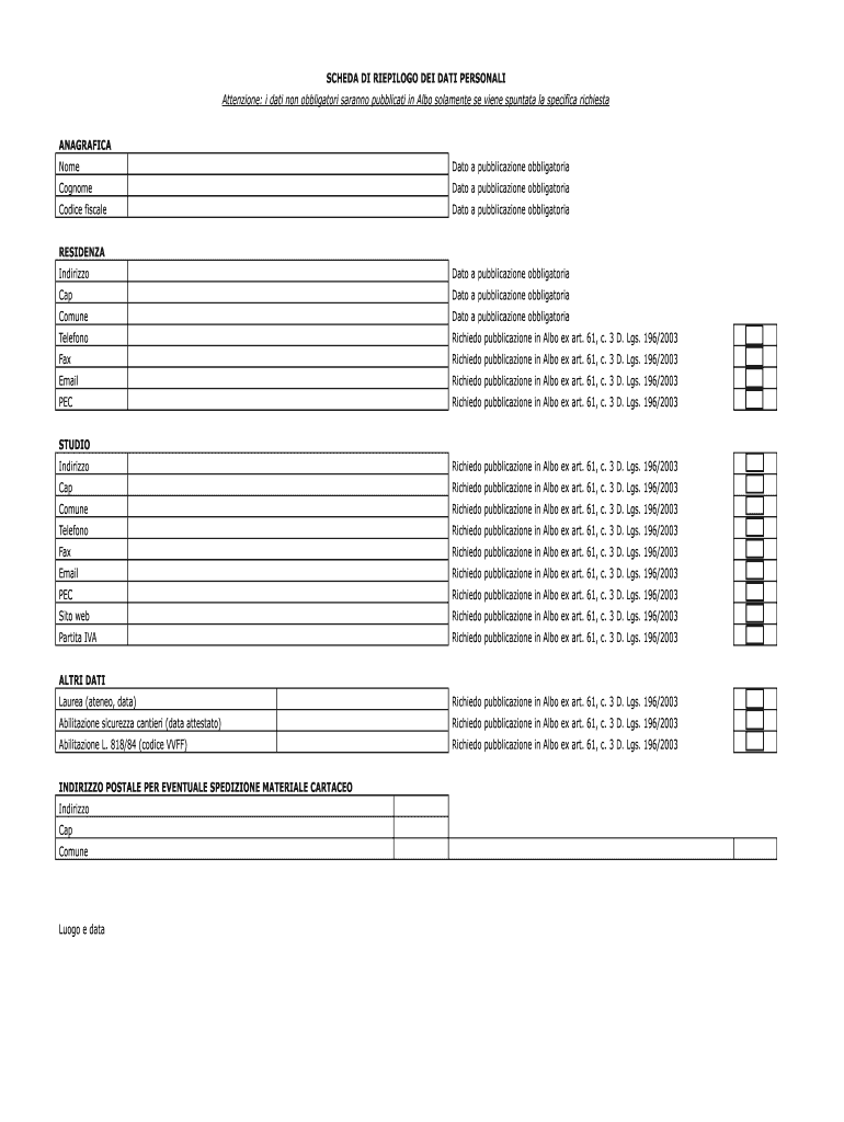 SCHEMA DI RIEPILOGO DEI DATA PERSONAL Attention: i data non-obligatory saran no publication in Albo solvent SE vain sonata la specific richest ANAGRAFICA Nome Data a publication obligatory Cognomen
