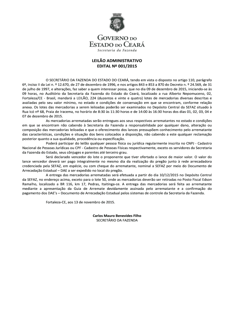 LEILA ADMINISTRATIVE EDIT AL N 001×2015 O SECRET RIO DA AGENDA DO ESTATE DOC EAR, tend em vista o disposal no artist 110, paragraph 6, incisor II the Lei n. 12.670, DE 27 de December de 1996, e nos