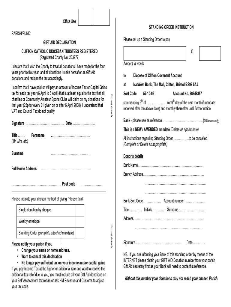 Office Use STANDING ORDER INSTRUCTION PARISH×FUND: Please set up a Standing Order to pay GIFT AID DECLARATION CLIFTON CATHOLIC DIOCESAN TRUSTEES REGISTERED (Registered Charity No: 233977) Amount