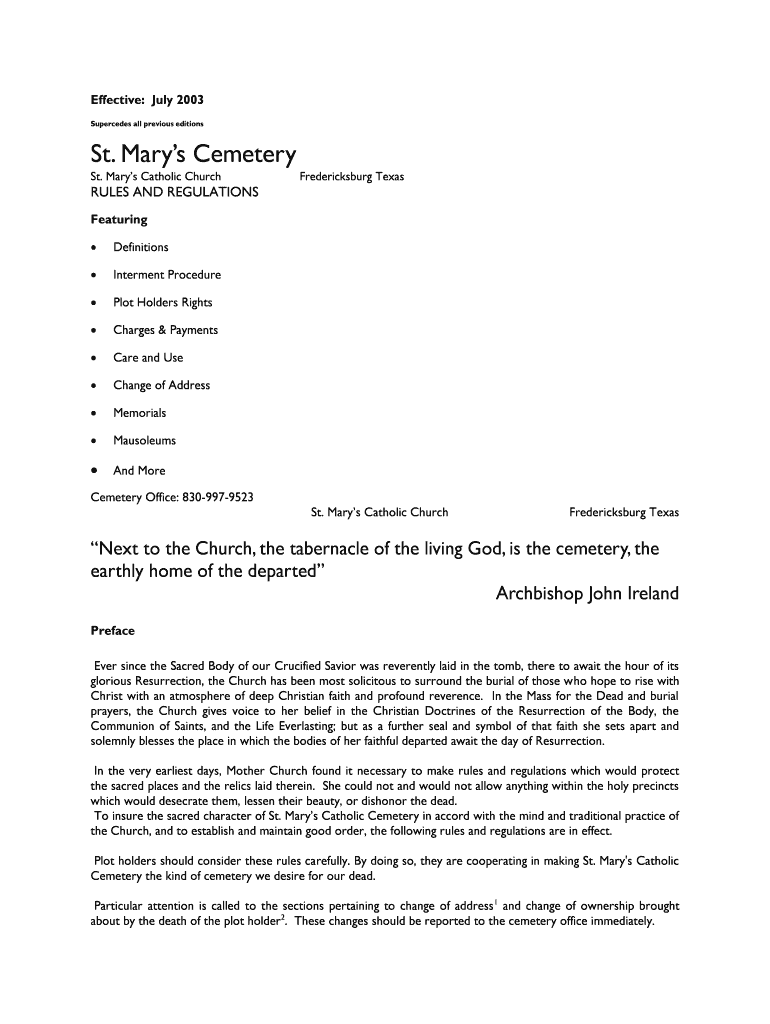 Effective: July 2003 Supersedes all previous editions St. Mary's Cemetery St. Mary's Catholic Church Fredericksburg Texas RULES AND REGULATIONS Featuring Definitions Interment Procedure Plot Holders