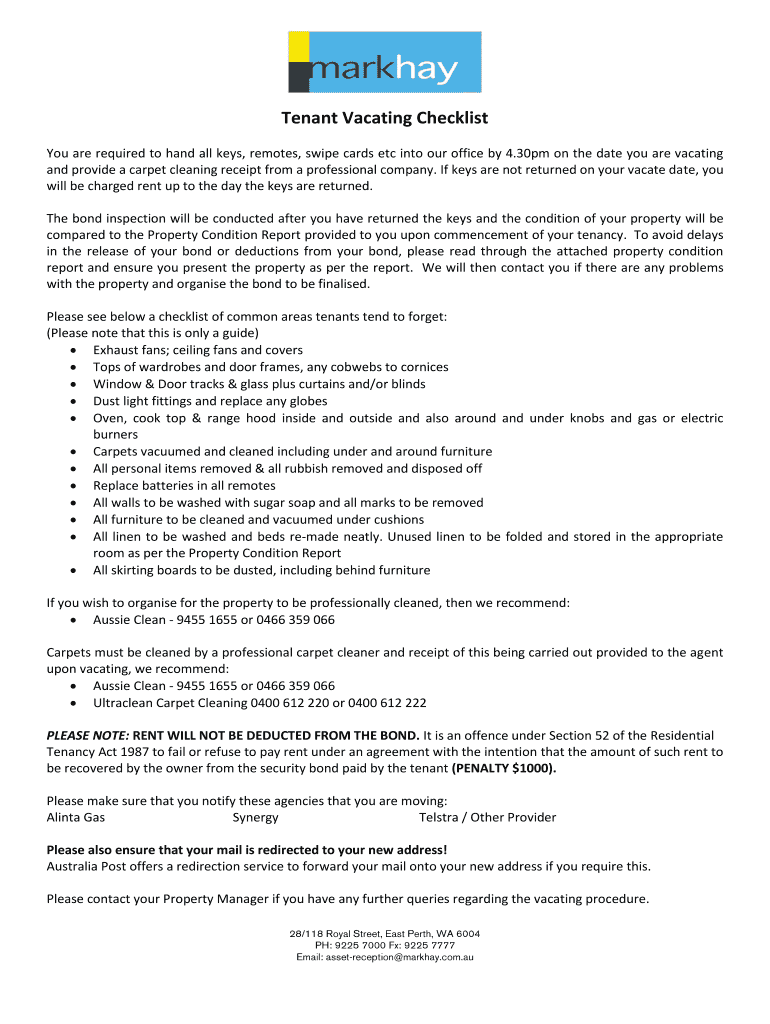 You are required to hand all keys, remotes, swipe cards etc into our office by 4.30pm on the date you are vacating