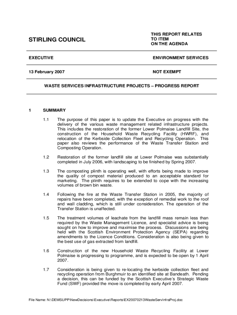 This report updates the Executive on progress with various waste management related infrastructure projects including the restoration of the Lower Polmaise Landfill, construction of the Household