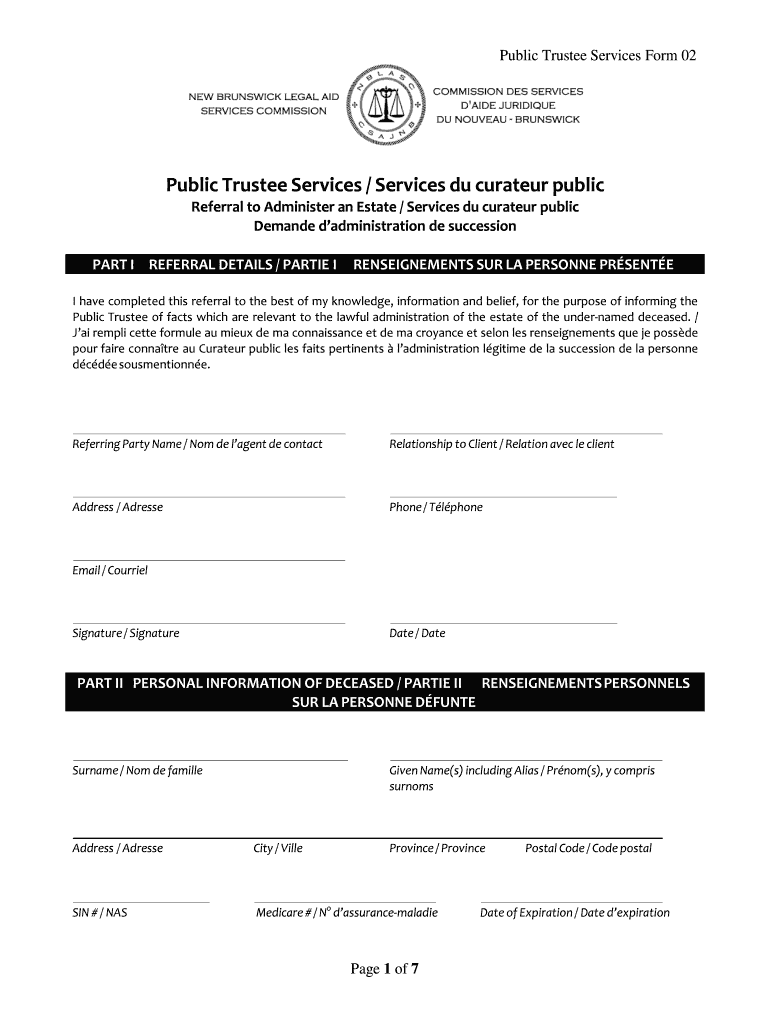 Get the free Public Trustee Services Services du curateur public - legalaid nb