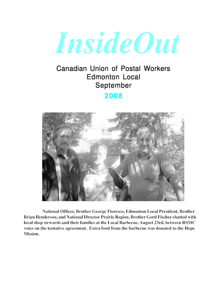 Insidious Canadian Union of Postal Workers Edmonton Local September 2008 National Officer, Brother George Flores co, Edmonton Local President, Brother Brian Henderson, and National Director Prairie