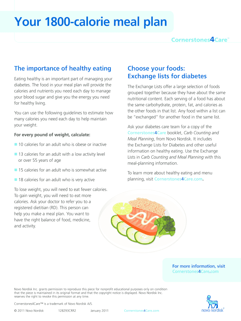 Your 1800-calorie meal plan The importance of healthy eating healthy is an important part of managing your diabetes. The food in your meal plan will provide the calories and nutrients you need each