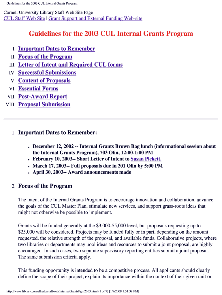 This document outlines the procedures, eligibility, and proposal requirements for the 2003 CUL Internal Grants Program at Cornell University Library, aimed at encouraging innovation and collaboration