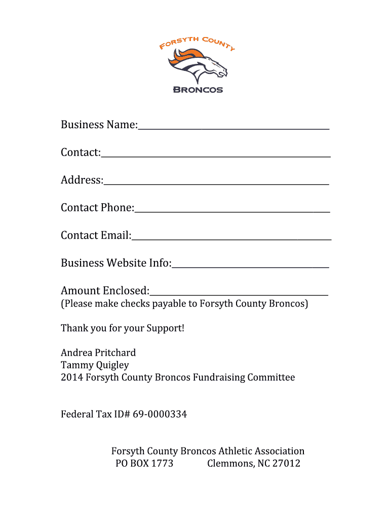 Business Name: Contact: Address: Contact Phone: Contact Email: Business Website Info: Amount Enclosed: (Please make checks payable to Forsyth County Broncos) Thank you for your Support! Andrea Pritchard