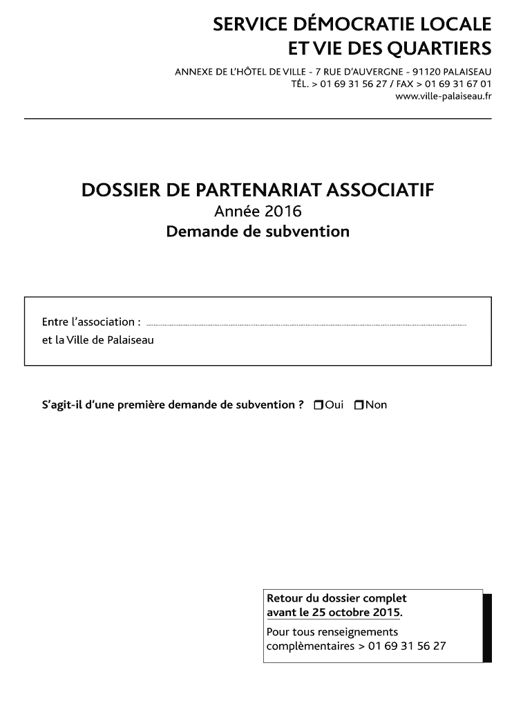 SERVICE DEMOCRATIC LOCALE ET VIE DES QUARTERS ANNEXED DE LHTEC DE VILLA 7 RUE DIVERGE 91120 PLATEAU TL. 01 69 31 56 27 / FAX 01 69 31 67 01 www.villepalaiseau.fr DOSSIER DE PARTENARIAT ASSOCIATED