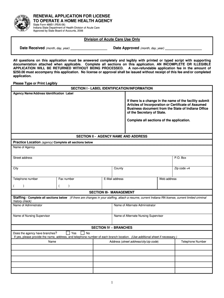 Reset Form RENEWAL APPLICATION FOR LICENSE TO OPERATE A HOME HEALTH AGENCY State Form 48851 (R5×606) Indiana State Department of HealthDivision of Acute Care Approved by State Board of Accounts,