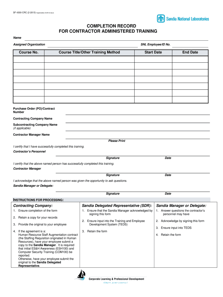 The Contractor Training Completion Record, formally known as the SF 4300-CRC form, serves a pivotal role in documenting contractor training. This training completion form is specifically designed to record the completion of contractor-administered training, detailing crucial information such as participant names and training specifics.
