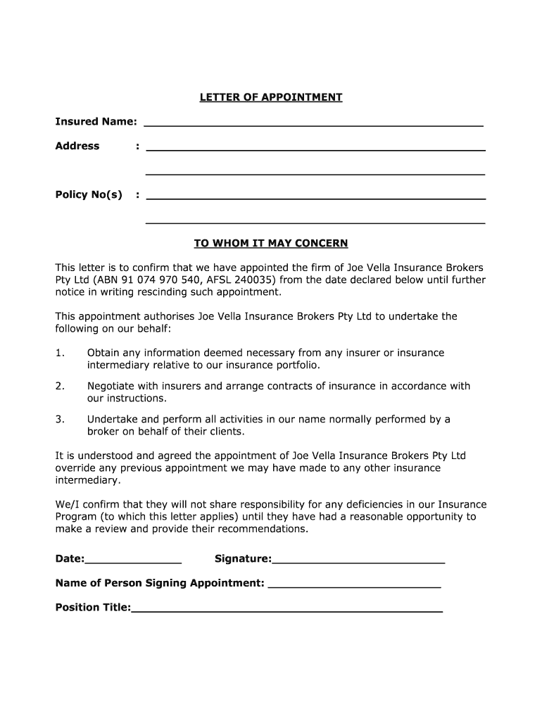 LETTER OF APPOINTMENT Insured Name: Address : Policy No’s) : TO WHOM IT MAY CONCERN This letter is to confirm that we have appointed the firm of Joe Villa Insurance Brokers Pty Ltd (ABN 91 074 970