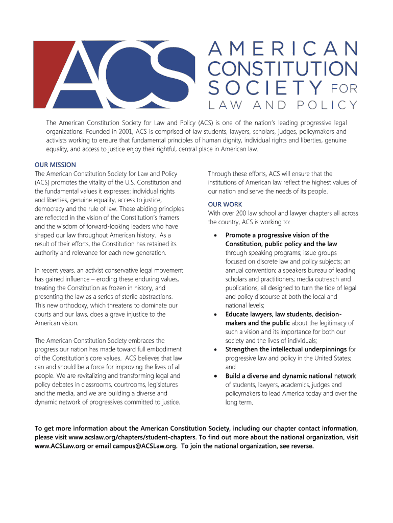 The ACS Membership Application Form is an essential document for individuals seeking to become members of the American Constitution Society for Law and Policy. This form is designed to streamline the application process, allowing applicants to provide necessary details that facilitate membership consideration.