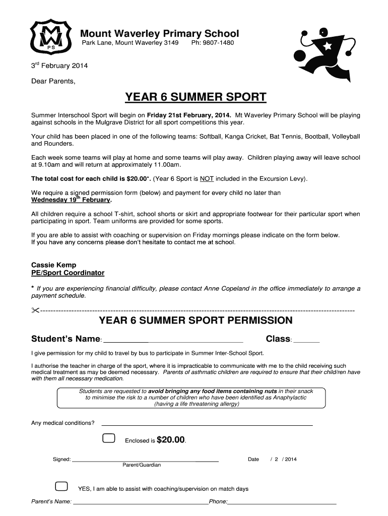 Get the free Year 6 summer sport permission - Mount Waverley Primary School - mtwaverleyps global...